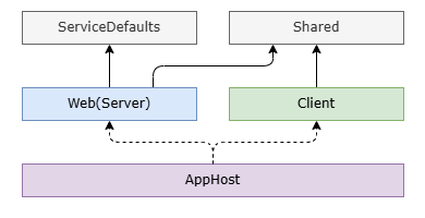 共有用のSharedをスキーマ定義として使い、それをClientとWebで参照する形です。AppHostはこの2つをまとめて起動する用。