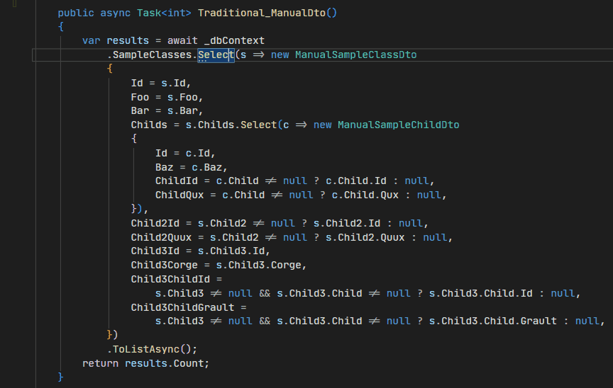まず、EFCoreのSelect式内部では ?.(null条件演算子)が使えません 。具体的にはExpression<...>内部では使用できない仕様となっています。